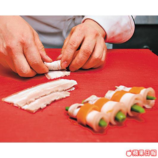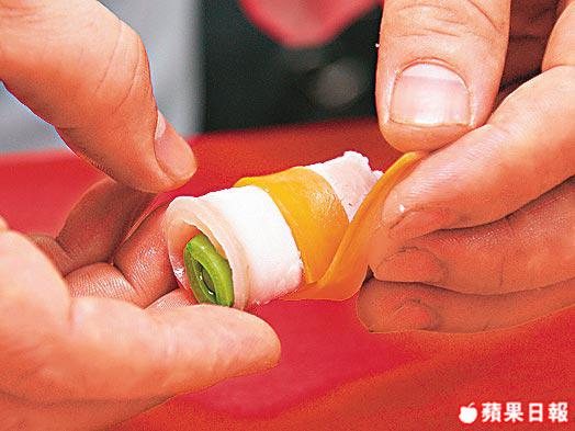 4.取出五花腩切薄片,捲入蜜豆,再包上甘笋片。