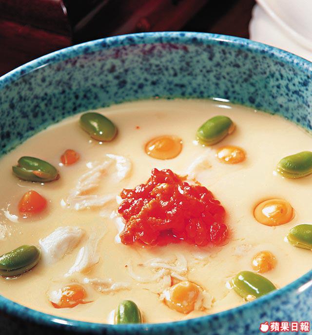 雞蛋3隻、海膽1/2排、蟹黃1茶匙、熟蟹肉1両、銀杏8粒、毛豆8粒、鹽少許、日本清酒1湯匙、雞湯1/2湯匙