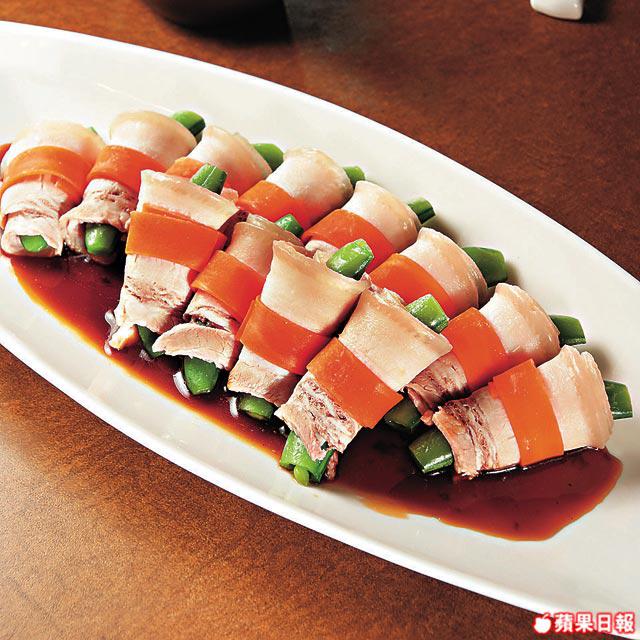 五花腩以白滷水汁醃過,味濃夠香,切薄片再捲上蜜豆,食落絕不覺得肥膩。