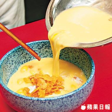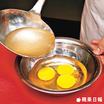 5.最後將日本清酒加入雞湯及鹽撈勻,淋上蛋面即成。