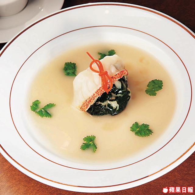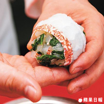 起初以為壽司魚即日本魚生,非也,原來梁師傅將菠菜混入東星斑肉搓成壽司形狀,然後再注入魚湯,有創意又別致。