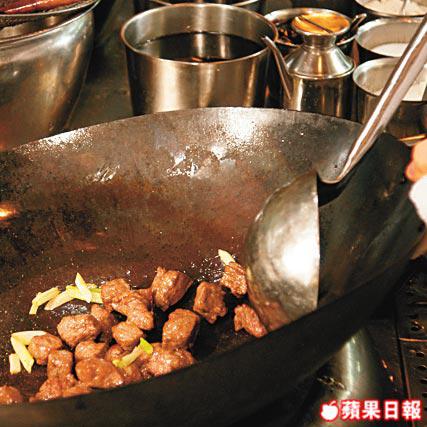 2.燒熱鑊,將牛柳肉炒至六成熟,加入紅椒、葱及蒜頭炒勻。