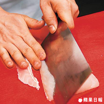 1.東星斑起肉,切出四塊薄片,將其餘斑肉切粒,魚頭魚骨留用。