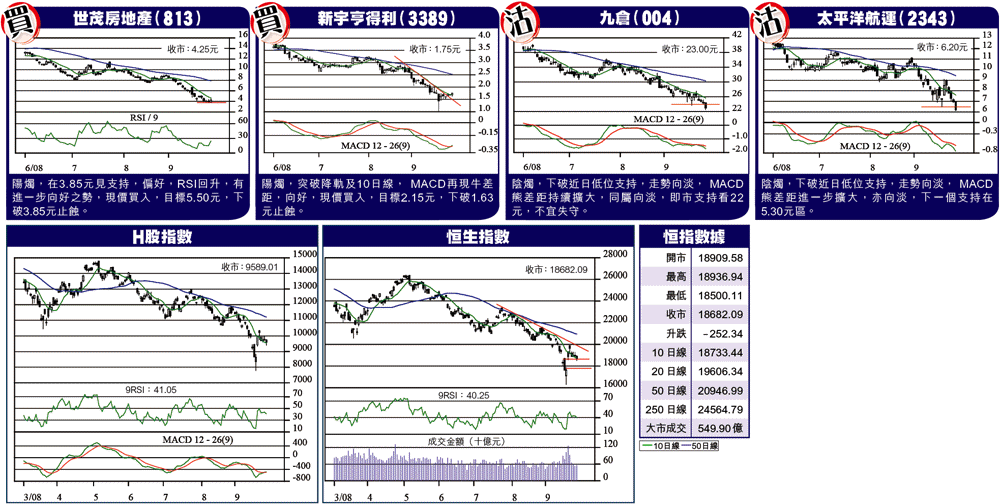 日線圖所見,連續呈現兩個十字後,恒指重回10日線(18733)之下,或者說仍在其附近徘徊。推動港股昨日下挫的主要原因,仍然是市場傳聞美國的7000億美元救市方案未必能通過,或者是要延期,可說是一波三折。當美國救市方案這支強心針開始失效後,大市回軟幾是必然,只是美國政府對金融體系是非救不可;另外,中國的救市決心亦是頗大,從國務院至證監會態度的轉變顯示,未來將有新的政策出台。在政府的力量是最大的假設下,股市反彈幾是必然的,問題只是時機而已,預期期指及基金季度結算過後,即國慶附近,大市會有明確方向。