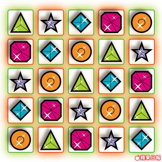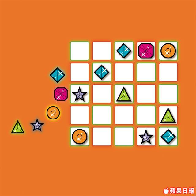 飛天小女警在追捕敵人時,竟不小心中了陷阱,被困密室。小朋友能把右列5種圖案填進空格,使每直行、橫行的圖案都不重複,以破解密碼鎖嗎?
