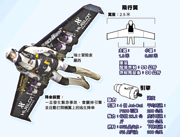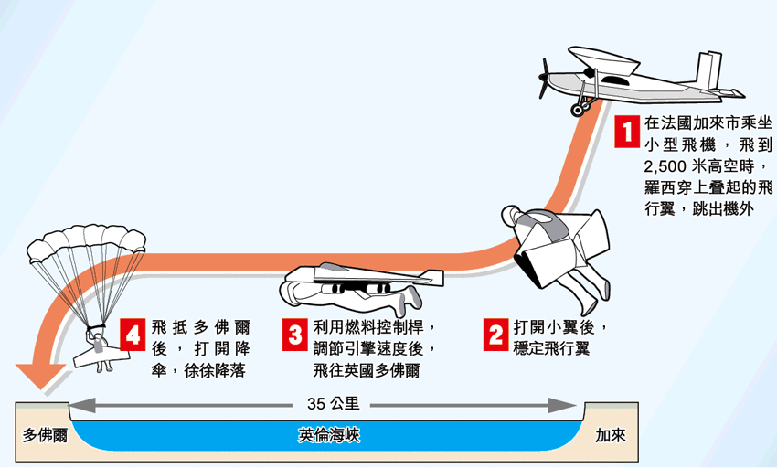 49歲的羅西是瑞士國際航空公司機師兼冒險家,昨午揹着碳纖維飛行翼,從法國加來(Calais)搭飛機起飛,當飛機飛到2,500米高時,從機艙躍出,然後打開飛行翼和啓動引擎,以時速200多公里,飛往35公里外的英國多佛爾(Dover)。10分鐘後,他抵達多佛爾時,在空中打轉,給觀眾表演花式,然後打開降傘在燈塔附近着陸。