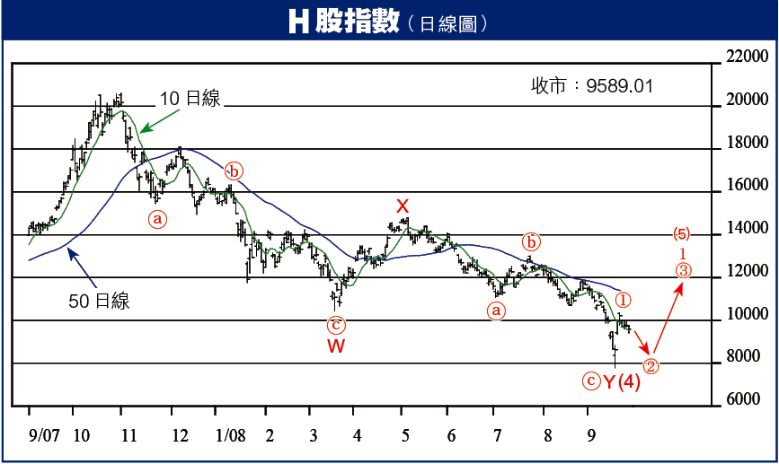 中浪(4)小浪A的細浪(a)為1月22日的恒指21710和H指11779,細浪(b)以「不規則形」方式反彈至5月5日的恒指26387和5月7日H指14783後,現細浪(c)下跌至9月18日恒指16284和H指7789後,完成整個中浪(4)小浪A下跌。