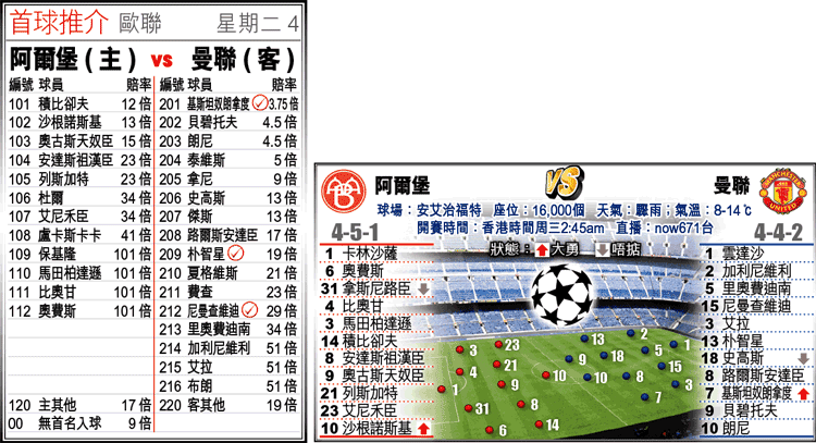 自葡萄牙翼鋒C朗復出後連番建功,曼聯亦兩戰俱勝;而且今仗陣容鼎盛,除中場卡域克因傷缺陣外,史高斯及雲達沙兩名老將分別在停賽及受傷中復出。阿爾堡上仗迫和蘇超些路廸,但多少存運氣,對手更有12碼宴客;而阿爾堡中堅積高臣今仗須停賽,難頂曼聯強攻,不過考慮曼聯在歐聯作客成績平平,宜敲客軍小勝。