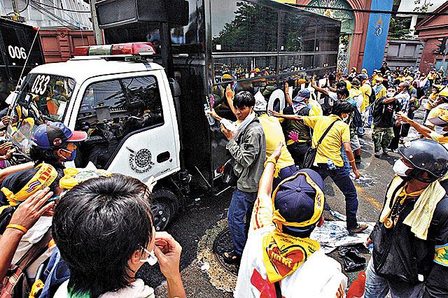 防暴警察昨晨向包圍國會大樓的示威者發射催淚彈,成功開出一條路給頌猜和議員入內開會。頌猜順利發表施政報告,但之後卻發現無法離開的困局,因為憤怒的群眾包圍國會大樓,面對群情洶湧,前來聲援的示威者增至8,000多人,迫使部份防暴警察棄下警棍和盾牌,以及六輛貨車逃走。