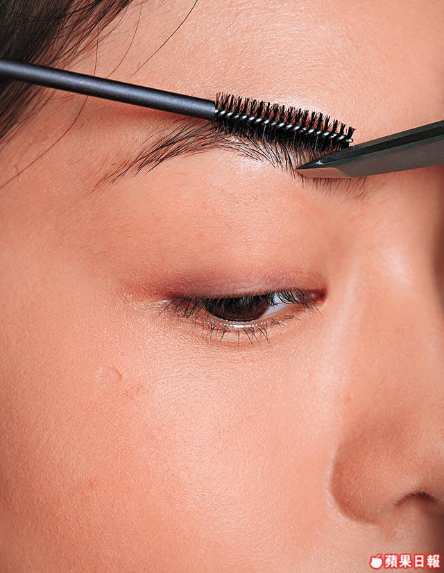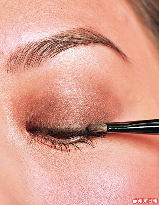 1.以深啡色加強眉尾輪廓後,先在眼蓋以米色打底,再在眼窩位掃上淺啡色,留意眼窩邊要鬆開。再從雙眼皮位開始向上漸次加上深啡色,特別是眼尾位置。再以啡色眼線啫喱畫上眼線,下眼線則以啡色眼影貼邊畫。