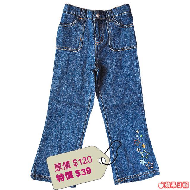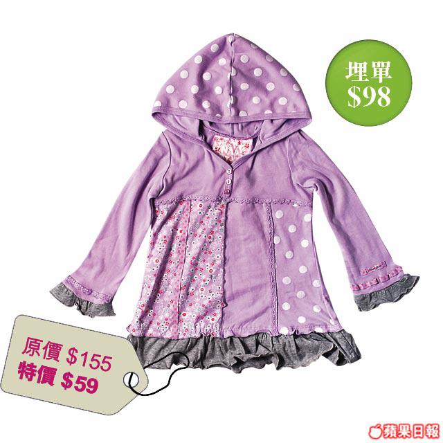 紫色娃娃裝連帽外套(適合3個月至10歲),另備粉紅、綠及桃紅四色。配星星綉花牛仔褲(適合2-6歲),醒目!
