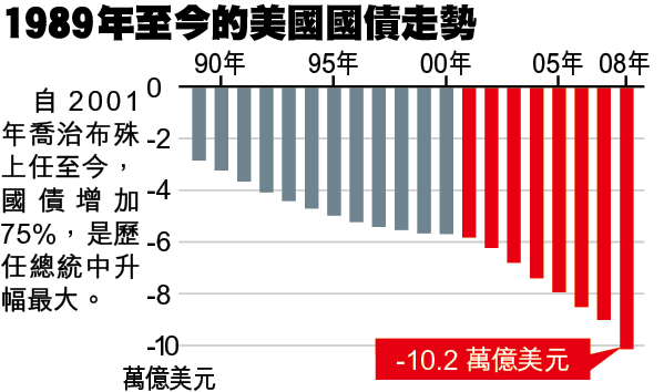 自2001年喬治布殊上任至今,國債增加75%,是歷任總統中升幅最大。
