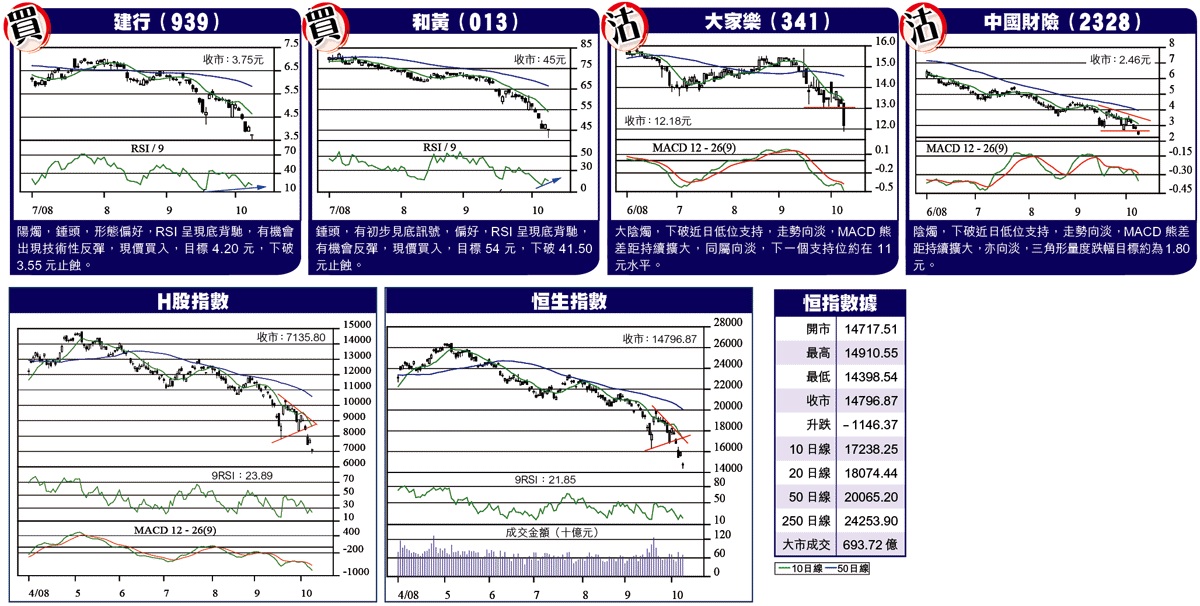 日線圖呈十字,在持續下挫後呈現拋離十字,有初步見底的味道,大市如能在現水平見底,不必向三角形最小量度跌幅目標14000進發的話,後市有機會出現較大幅度的反彈。當然,如果歐美局勢進一步惡化的話,投資者要有更壞的打算。