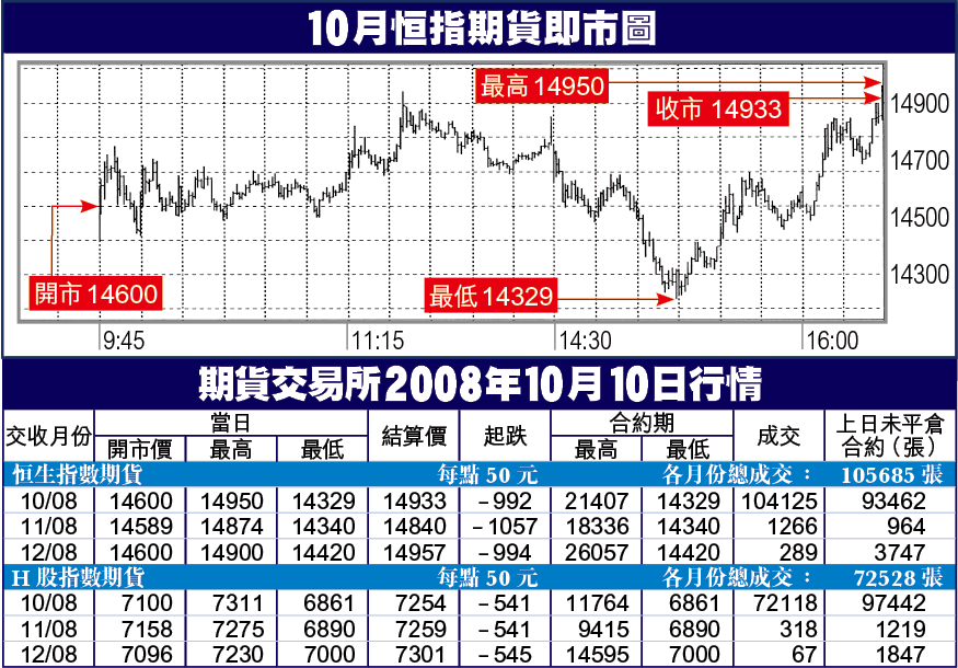 在恐慌性拋售下,期指本周出現第3個裂口下跌,失守15000,直插至14329低位,尾市有技術反彈,報收14933,急挫992點,轉高水137點。