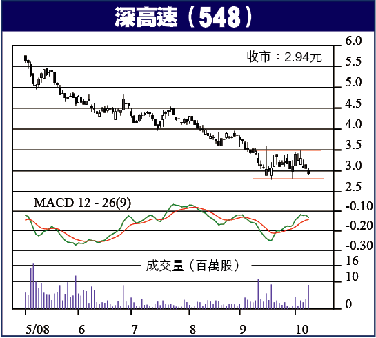 一年前,深高速(548)企喺9.50元水平,噚日3元大關又再跌穿,較一年前高位跌近7成,去番兩年半前水平,現時往績PE8.9倍,息率6厘,已開始有吸引力,2.80元係重要支持位,若然跌穿,則到2.50元就可以慢慢收集。