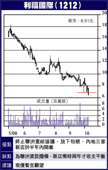 利福現價6.51元,往績PE11倍,息率3.8厘,預期今年業績續有輕微增長(不計貸款撥備),而明年的增長已有疑問,在經濟轉差時,消費股不應樂觀。