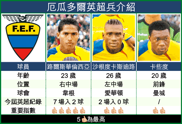 厄瓜多爾為爭出線,今次大軍名單坐擁多名英超兵在陣,包括韋根大勇翼鋒路爾斯華倫西亞、曼城前鋒卡些度及愛華頓中場沙根度卡斯廸路等;加上防線又有高士路大將艾斯賓路沙領軍,中前場亦有燕豪芬的艾廸臣文廸斯負責攻堅,實力完整。別忘記,厄瓜多爾對上6次迎擊智利,有4次能擊敗對手。