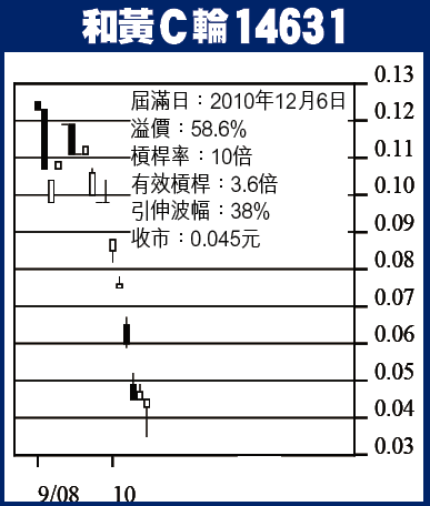 和黃C輪14631:和黃(013)上周五收45元,日線圖現長尾錘頭,股價有回穩迹象,短線反彈睇55元,可以吼位買啲C輪14631博反彈,隻輪現價4.5仙,有效槓桿3.6倍。