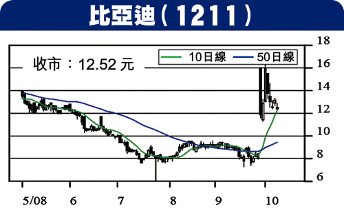 業務包括佔全球手機電池巿場3成份額的二次充電電池業務、手機部件及組裝業務,以及汽車業務,其中汽車業務除會有新型號推出外,被股神看中的雙模汽車亦漸踏入巿場化,現時油價相對數年前仍屬高位,料環保節油電動汽車有不俗潛力。不妨作中長線投資,如作短線買賣,可於12.50元買入,目標16元,11元止蝕。