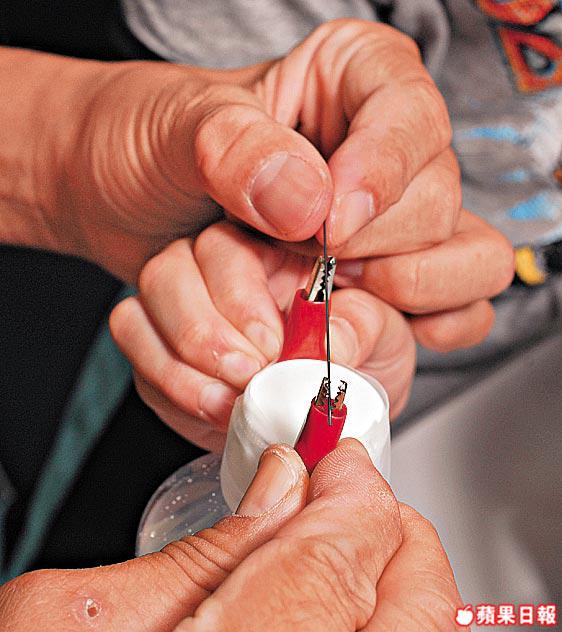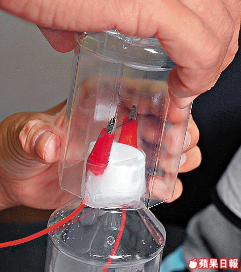 2.膠水樽割開兩半。把電線的箝子繫在樽口。