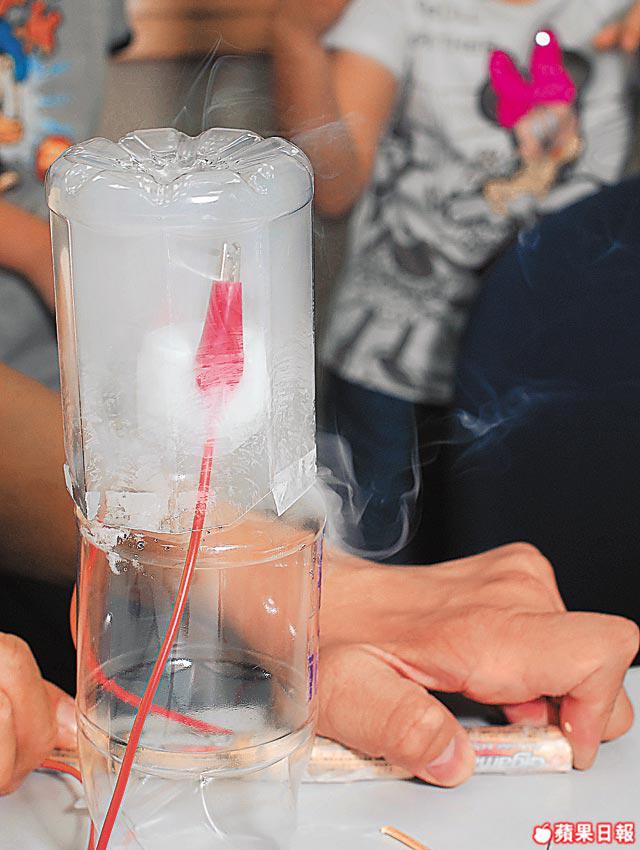 3.手按盒左右兩邊往內擠,熱空氣(煙)受壓往外衝形成冬甩形煙圈可將紙人打倒。