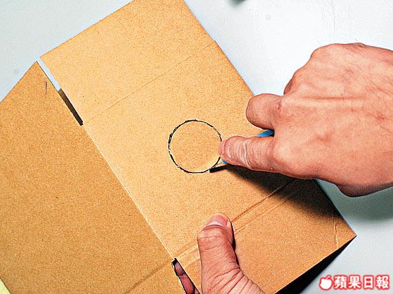 4.將木條用膠紙貼在紙巾盒上,洞口位置向上。