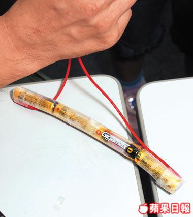 4.用力按緊電線與電池接駁位,電力通過電線令筆芯變熱,最後更冒出白煙。