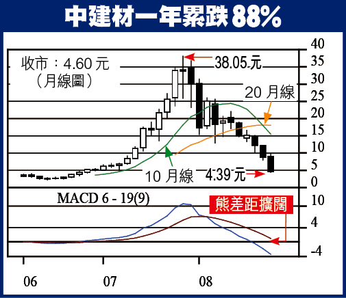 大跌後,中建材往績PE9.4倍、P/B1.29倍。以08年度(12月年結)上半年多賺1.1倍至5.45億元(人民幣.下同)計,全年料賺13.6億元,增49%,每股盈利0.62港元,PE調低至7.4倍,比同業中材股份(1893)預測PE12.4倍,有40%折讓。
