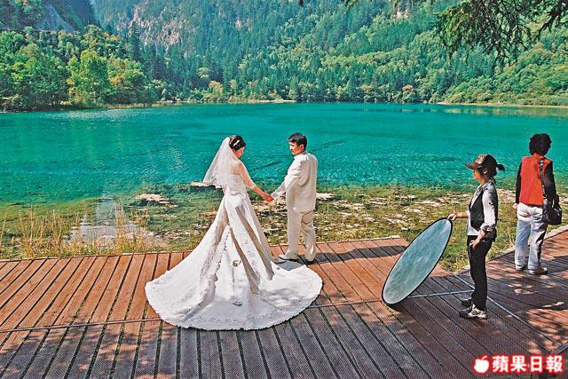 往五花海入口,迎面走出一對新娘新郎,而湖邊一片小空地,另有兩對新人正在拍攝婚紗照。其中一位從杭州來的新娘,氣質出眾,忍不住跟新郎讚美一句:「你的新娘很美!」怎知他說:「是嗎?我還想休了她!」不知那來的牙尖嘴利,我說:「你肯定是你休她,不是她休你?」然後一齊哈哈大笑,不敢再打擾他們,我沿着湖邊棧道,拍水底枯木珊瑚去。