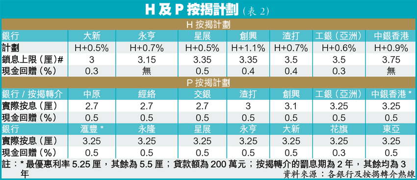 她又提醒業主於轉按前,除要考慮息差因素,還須計算在罰息期轉按的費用支出。如選H計劃,就要有鎖息上限的功能,拆息一旦抽高,也可轉P計劃作後盾。不過,鎖息上限利率會較P計劃高,近期拆息高企,大部份H計劃實際按息均為鎖息上限,實際上是畀高息,並不化算。