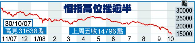 以估值計,港股歷史市盈率(PE)雖由去年10月高峯的26倍,跌至現時8.9倍,惟相比98年金融風暴8倍而言,未算十分超值。假設PE跌抵至8倍,恒指將再跌約1600點至13200水平。