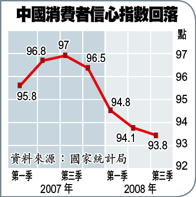 內地第三季消費者信心指數(CCI)為93.8,較上季度回落0.3個百分點,連跌四季;反映消費者在全球經濟放緩和股市下跌情況下,對未來增加收入信心不足的心態。