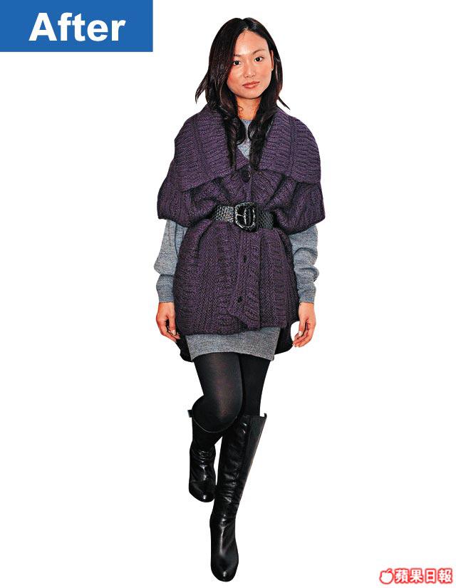 Sisley店員Katherine:「加了深紫色外套更能突出膊頭位,皮帶亦更加幫忙製造高腰效果,而又不會令上身太過累贅。」