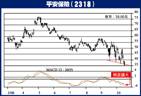 小邱雖認為中資股形勢不致太差,惟經過上周五之急跌後,主要中資股份圖表走勢已見轉差,如平保(2318)上周五以大陰燭跌穿近期4次力守的底部支持,MACD熊差再擴大,以圖論勢,確實是呈破位向下。由於內地股市有機會出現反彈,內地保險股也不應太淡,惟純以圖表來看,要等較強的買入訊號出現才敢買貨。
