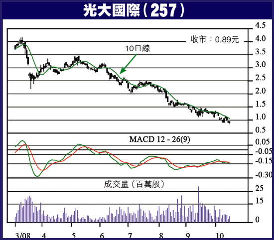 08年全年,估計光國盈利可達3.1億元,每股盈利10仙,預測PE不足9倍,09年進入收成期,盈利會大增,PE調低到6至7倍之間,以環保股而言,頗為吸引,短線伺機博反彈,亦可趁低吸入作中線持有。