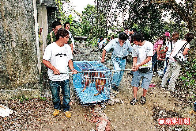 昨天下午2時許,20名貓狗義工,帶着鐵籠、繩索、鐵鎚上山,將石屋大門的鐵鏈和鎖頭砸開後,衝入屋內,用鐵籠載走屋內一大四小共五隻唐狗,義工並帶走屋內所有刀具及煮食用具,另外,在石屋對開一千呎範圍撿走逾百件懷疑狗骨。