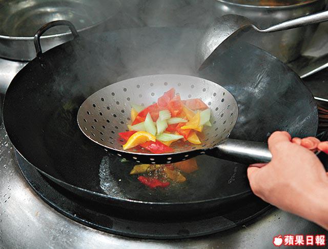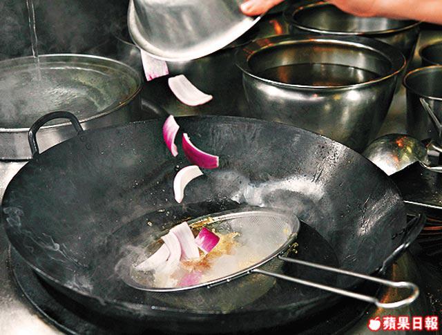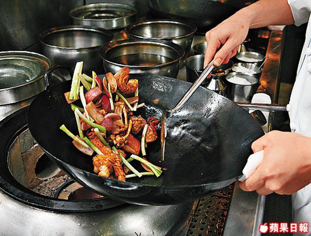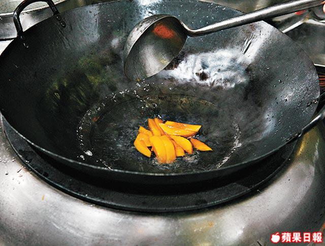 龍蝦炸得耐會韌,一轉橙色就可以撈起,這時只是外表熟而心未熟,回鑊與洋葱、葱一起炒時才將之炒熟。