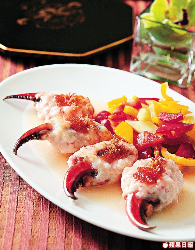蟹箝4隻、蝦膠4両、紅/黃燈籠椒各適量、西芹適量、生粉少許、炸瑤柱絲/蟹子適量