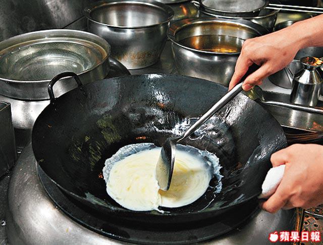 4.起鑊炒鮮奶,成形後加芒果及燕窩略炒,撈起鋪在米粉上即成。
