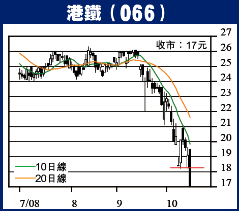 地產、公用業務「兩溝」的港鐵(066)近月亦出現洗倉式跌浪,上周五瀉近11%,低收17元,股價時光倒流至06年3月。