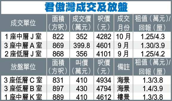 美聯林振聲表示,君傲灣10月市況淡靜,首12天僅1宗成交,為3房池景單位,面積822方呎,呎價4282元,反觀9月整月有14宗成交,2及3房各佔一半,其中千呎海景大戶,呎價更高達5700餘元。