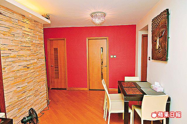 單位裝修花過心思,客飯廳造一幅特色牆,頂部建假天花燈槽,下方分別鋪砌文化石及貼上深色牆紙,締造視覺姿采。廚廁以外牆身髹紅色油漆,顏色搶眼。