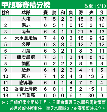 至於在「大陂頭」舉行的另一場甲組波,天水圍飛馬藉陸冠邦及安杜的入球,以兩球淨勝謝菲聯;該仗各有一人被逐,天水圍外援麥保美在58分鐘先領紅牌,謝菲聯老將王安治補時階段因向對方球員批踭,成為賽事第2位「紅牌阿姑」。