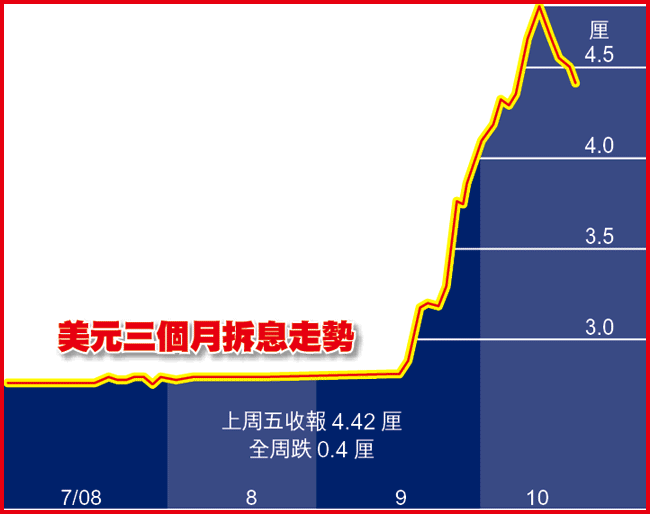 英國銀行家協會(BBA)表示,3個月美元倫敦銀行同業拆息(LIBOR)連跌5日,上周五跌8點子至4.42厘,全周跌40點子,是7月以來首周錄得跌幅;至於隔夜拆息上周五跌27點子至1.67厘,是04年9月以來最低,全周跌80點子。