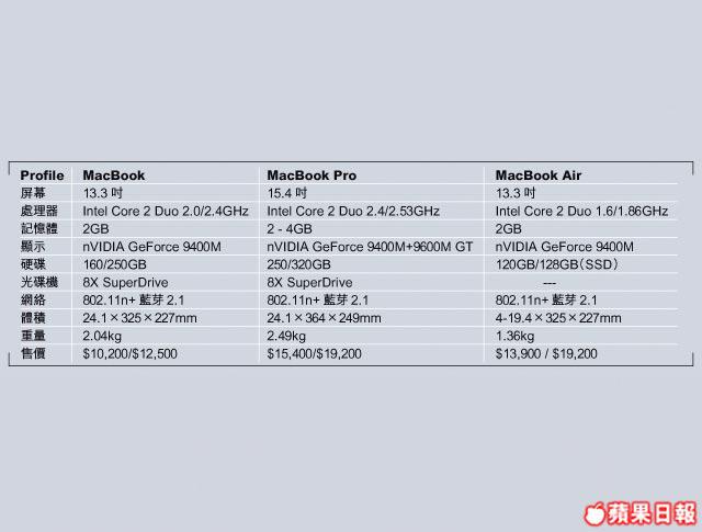 MacBookPro外形與MacBook大同小異,一副兄弟班樣子,屏幕大小為15.4吋,同樣用上LED背光燈,而機面設計、物料到機背蘋果Logo都無大分別。而MacBookPro強項圖象處理方面,新機更為突出,分別內置整合式nVIDIAGeForce9400M及獨立GeForce9600MGT,前者於省電模式時使用,約可延長1小時使用時間,而後者則可於3D畫面上使用,圖象速度約可提升兩倍!
