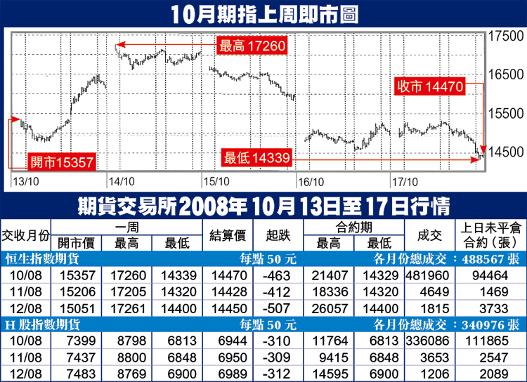 期指上周初曾大幅反彈,但稍為升破10日線即掉頭下跌,未能重上17500水平,其後以大裂口破位,低收14470,全周累跌463點,低水84點。