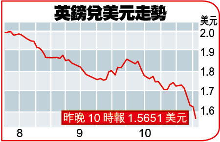 滙市本周繼續刮狂風暴雨,但走勢卻較為明朗,美元與日圓雙雙展翅高飛,而歐幣和一眾新興市場貨幣卻沽壓沉重。執筆時歐元已跌至1.25邊,較上周收市價跌了逾9美仙,但與英鎊相比,跌幅仍是小巫見大巫。英鎊周一曾反彈至1.7516美元,與昨日低位1.5270比較,單周高低位相距逾2200點,昨日單日波幅已逾千點,若買錯邊而又沒有設止蝕的話,必然喊得一句句。