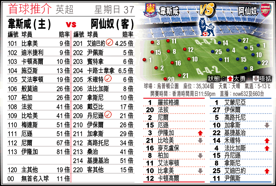 韋斯咸冰島班主破產,說球員不擔心出糧問題是假的,事實亦反映球隊近期演出不濟;周日更要在打吡戰迎擊勁旅阿仙奴,韋斯咸再輸絕不為奇。畢傑熱選1.57倍客W,另吼阿仙奴淨勝3:0的「客勝」波膽。(球賽編號:星期日37;now632及660台今日11:59pm直播)畢傑