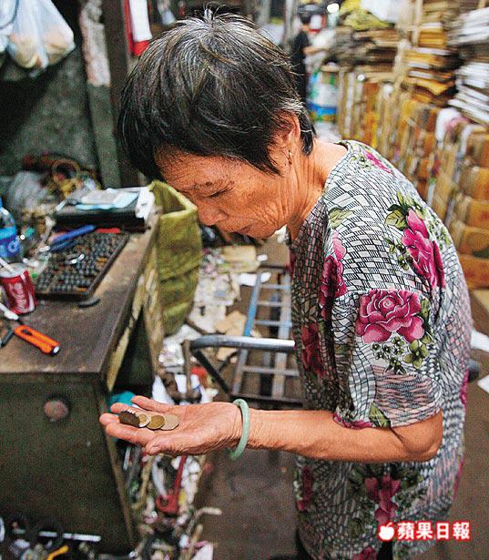 在灣仔春園街的橫街窄巷,鄧婆婆把拾來的汽水罐賣給回收店。兩小時到處搜刮,只賣得6.5元。她說,「以前一個汽水罐賣一毫子,一日可以賺到10蚊。今時今日,汽水罐唔值錢,搵唔到食都要執。」她語帶傷感表示,03年沙士疫潮時,每天拾汽水罐也有20元。如今鄧婆婆一臉茫然,拖着筋疲力竭的身驅,繼續在灣仔鬧市搜尋快將分文不值的汽水罐。本報記者