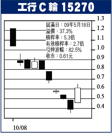 工行C輪15270:工行(1398)佔恒指比重近5巴仙,係重磅股前列分子,昨日股價升返3.26元收市,下個目標係3.53至3.88元,可以諗吓隻C輪15270,隻輪昨收61仙,有效槓桿2.7倍。